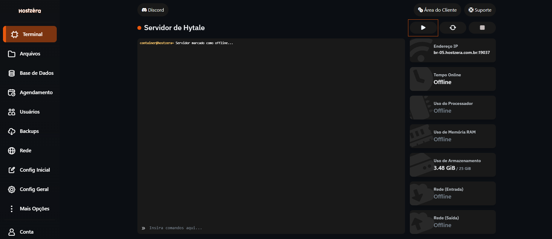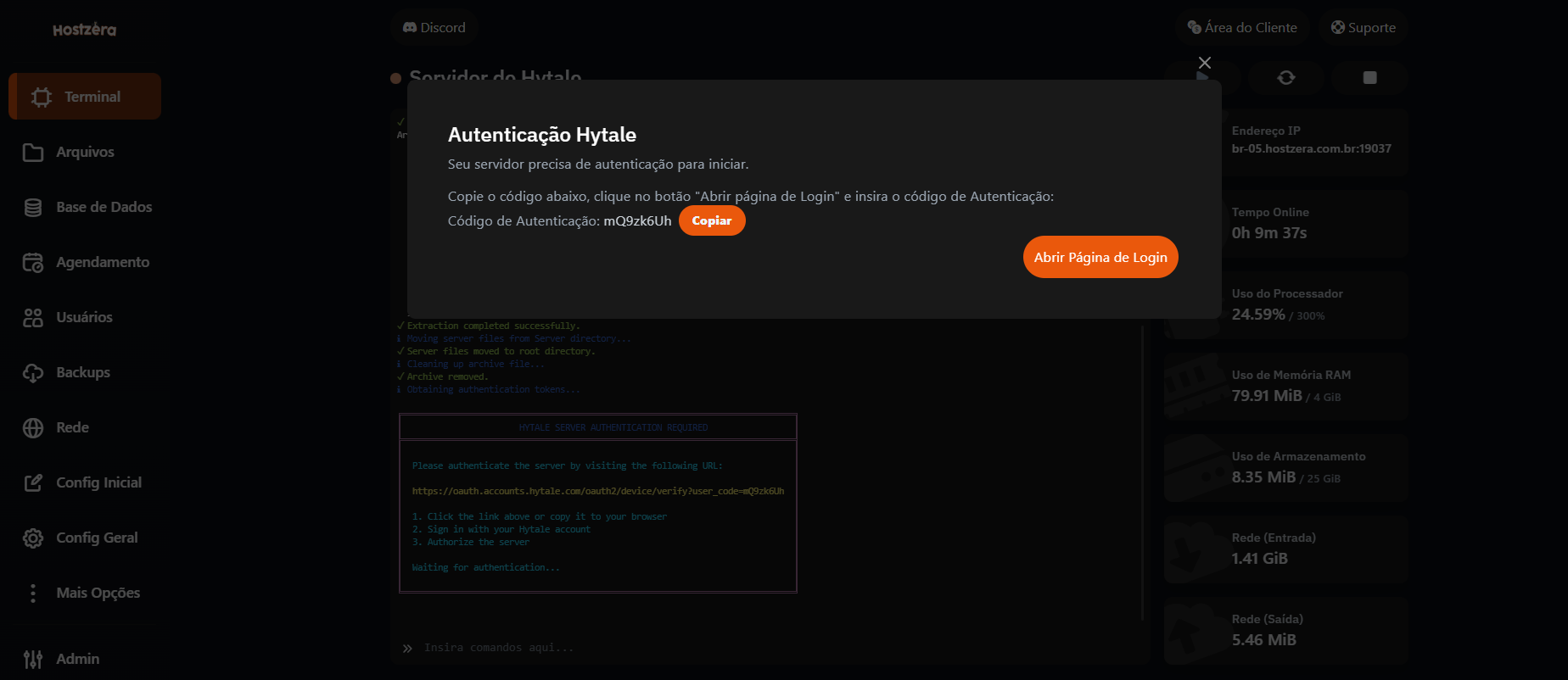 - O Primeiro passo é você navegar até o terminal da hospedagem Hytale que você adquiriu. Na Hostzera, acesse o painel de controle clicando AQUI, e navegue ate a aba Terminal do seu servidor